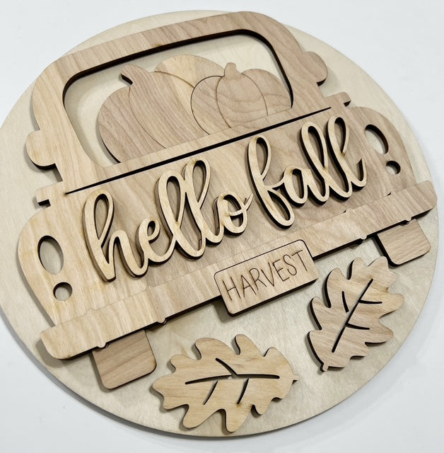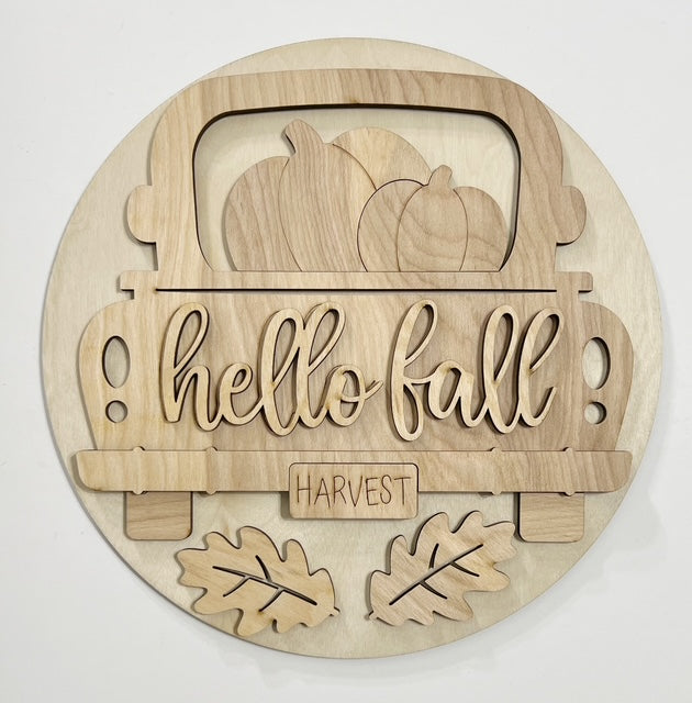Hello Fall Truck Harvest Pumpkins Leaves Doorhanger 10"