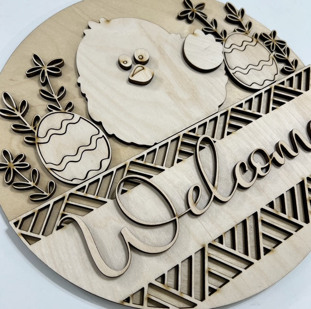 Welcome Easter Chick and Eggs with Geometric Border Round Doorhanger 10"