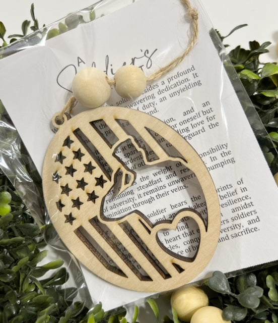 The A Soldier's Heart Story Card Ornament Charm is expertly laser cut from 1/4" maple wood, honoring courage and dedication with every detail. This meaningful ornament serves as a heartfelt tribute to the bravery and strength of those who serve. Its warm natural finish adds a timeless touch, making it a powerful gift that inspires gratitude and remembrance.