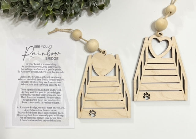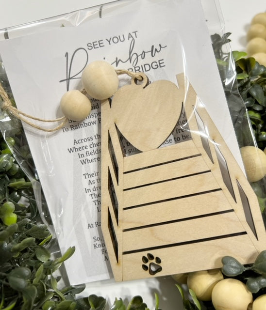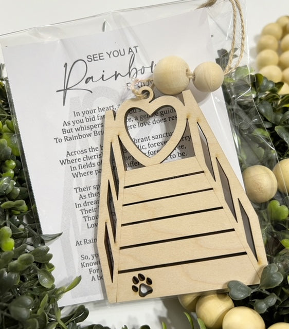 The See You At Rainbow Bridge Story Card Ornament Charm is beautifully laser cut from 1/4" maple wood, featuring a heartfelt dog pawprint design. This touching keepsake honors the cherished memory of a beloved pet, offering comfort and connection. Its natural wood finish adds warmth to any space, making it a meaningful gift that celebrates the enduring bond between you and your furry friend.