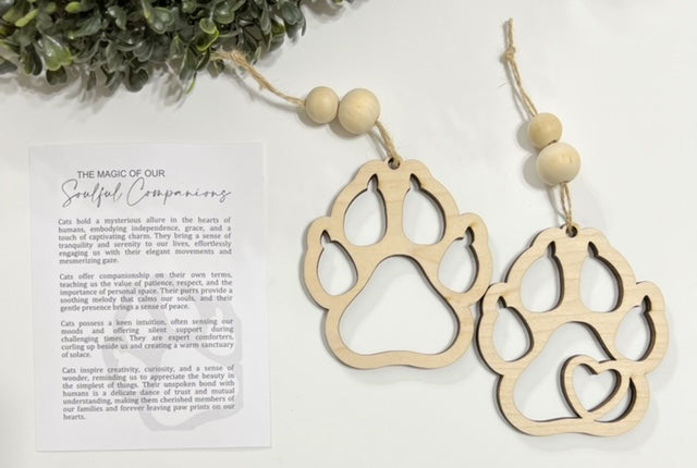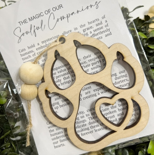 The Magic of Our Soulful Companions Cat Paw Story Card Ornament Charm is finely laser cut from 1/4" maple wood, featuring a delicate cat paw design that celebrates the deep bond with your feline friend. This charming ornament serves as a heartfelt tribute, making it a perfect gift to honor the love and magic shared with soulful companions. Its natural wood finish adds warmth and timeless beauty to any space.